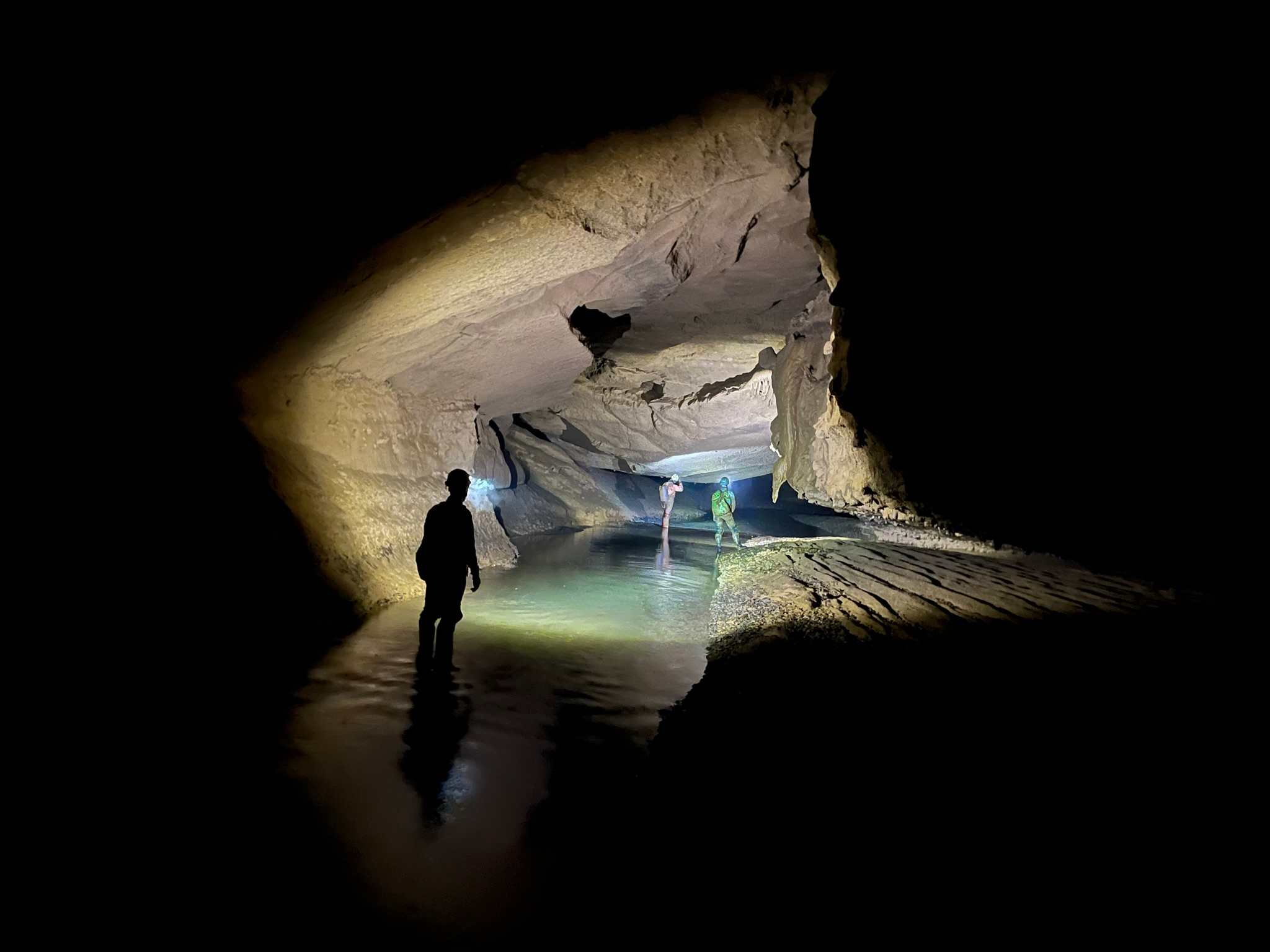 Notice the negative space defining the passage dimensions (illuminated by the nearest caver's light). And notice the reflection in the water. These are the sorts of "negative space" and "contrast" knobs to fiddle with, which can make a very compelling photograph, and represent the cave "as you would see it".